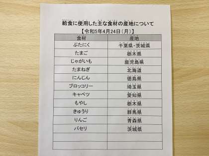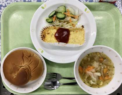 今日は、黒砂糖パン、具だくさんオムレツ、アップルドレッシングサラダ、レンズ豆のスープ、牛乳です。