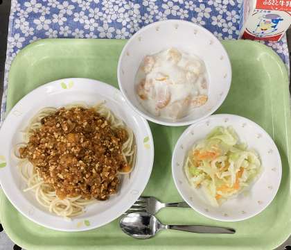 今日は、スパゲッティミートソース、キャベツサラダ、フルーツヨーグルト、牛乳です。