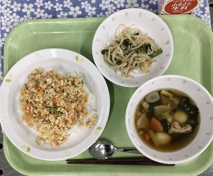 今日は、ふわふわそぼろ丼、もやしのごま風味、じゃがもち汁、牛乳です。