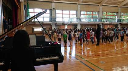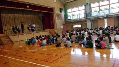 体育館に、2〜6年生の子どもたちが集まって、離任された先生方を迎えました。