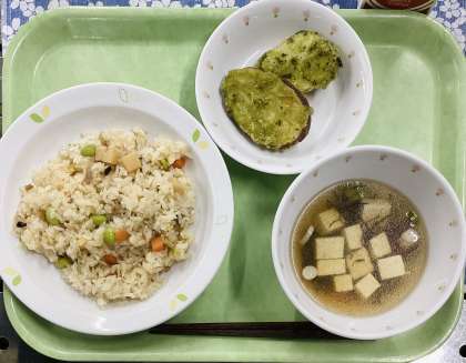 今日は、中華おこわ、煎茶揚げ、もずくと豆腐のしょうが汁、牛乳です。