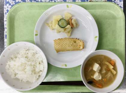 今日は、ごはん、いかのピリ辛焼き、じゃがいものごま和え、呉汁、牛乳です。