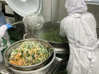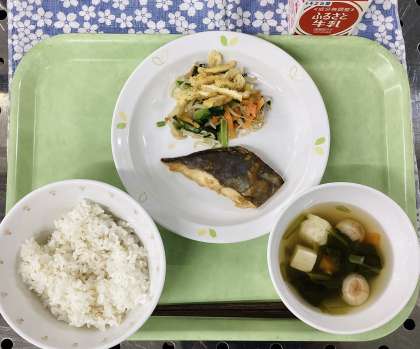 今日は、ごまごはん、魚の香味焼き、カリカリ油揚げと野菜のおひたし、お麩と小松菜のすまし汁、牛乳です。