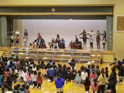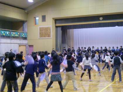 3年生は、AKBの曲にのってのダンス、4年生は、エヴザエルの曲で、はねこバージョン応援ダンス、5年生は、猛獣狩りバージョンで「中学へ行こうよ」、全校みんなで大盛り上がりでした。