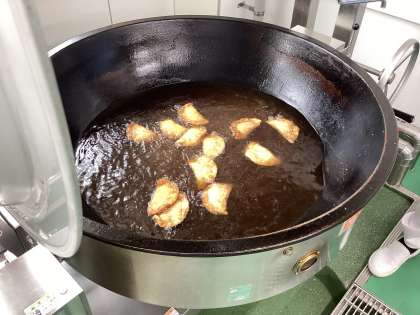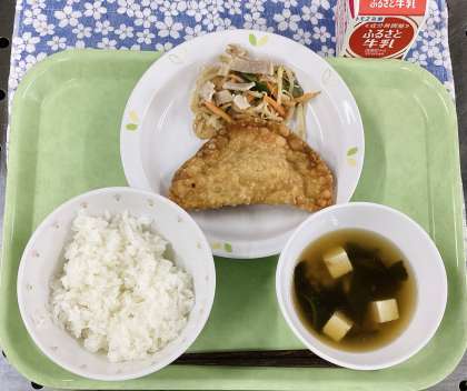 今日は、ごはん、ジャンボぎょうざ、中華風ごまだれかけ、わかめとコーンのスープ、牛乳です。