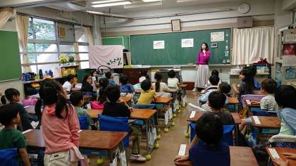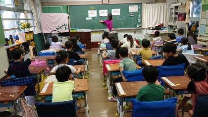 先生が黒板に貼った絵から気付いたことをすすんで発表する子どもたちです。