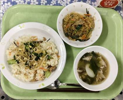 今日は、ビビンバ、チャプチェ、トックスープ、牛乳です。