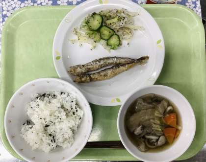 今日は、わかめごはん、ししゃもの二色揚げ、野菜のゆかり和え、せんべい汁、牛乳です。