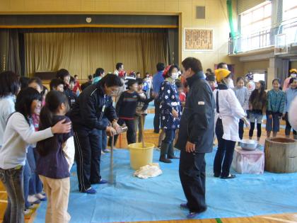 餅つきは、杵の持ち方等、保護者の方々がていねいに教えてくださったので、上手にできました。この餅つきは、地域の方々のご協力を得て、行っています。皆様のご協力に感謝致します。