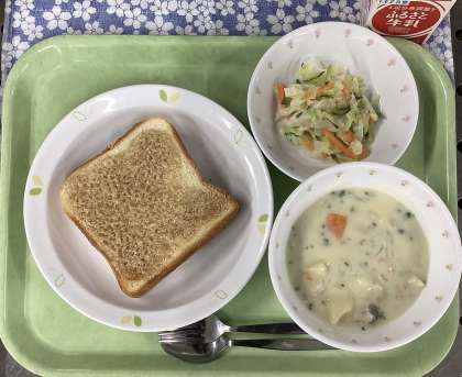 今日は、セサミトースト、コールスローサラダ、えびとポテトのクリーム煮、牛乳です。