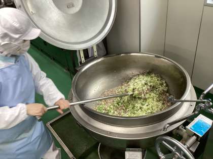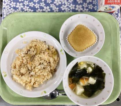 今日は、キムチチャーハン、わかめスープ、マーラーカオ、牛乳です。