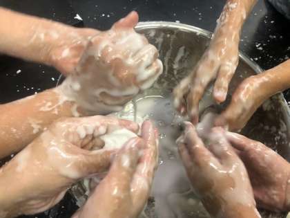 片栗粉と水で作ったダイラタンシー流体に、ぎゅっと握ってはそうっと手を開いてみたり、表面を叩いてみたりといろいろな感触をずうっと楽しんでいました。