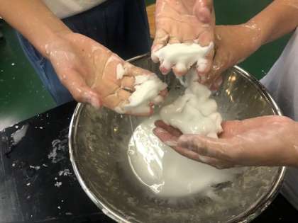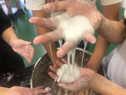 今日は、ダイラタンシーについての実験をしました。ダイラタンシーとは、ゆっくり触わるとドロドロなのに、素早くたたくと固くなるという現象のことです。