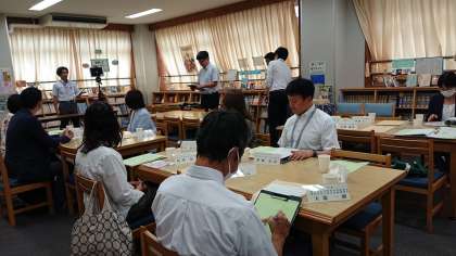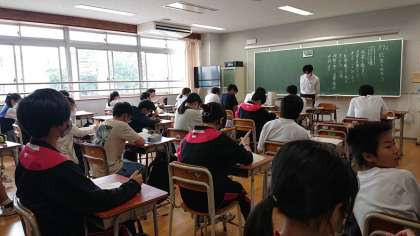 今日の午後は、「学び舎の日」ということで桜丘中学校の授業を参観して学び舎の幼稚園・保育園・小学校・中学校の教員が交流しました。