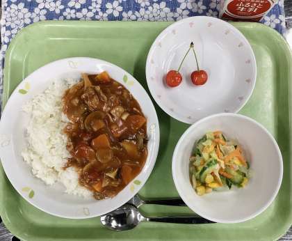 今日は、米粉のハヤシライス、コーンサラダ、さくらんぼ、牛乳です。