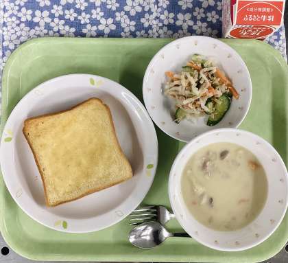 今日は、はちみつレモントースト、大根とツナのサラダ、森のチャウダー、牛乳です。