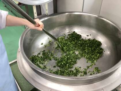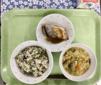 今日は、高菜ごはん、魚の照り焼き、かきたま汁、牛乳です。