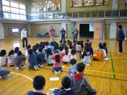 1年生が体育館に集合し、竹とんぼをとばしました。竹とんぼのとばし方は、「物!手作りの会」の方々にご指導いただきました。安全に楽しく遊ぶ方法を教えていただき子どもたちは大喜びでした。