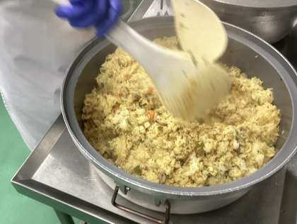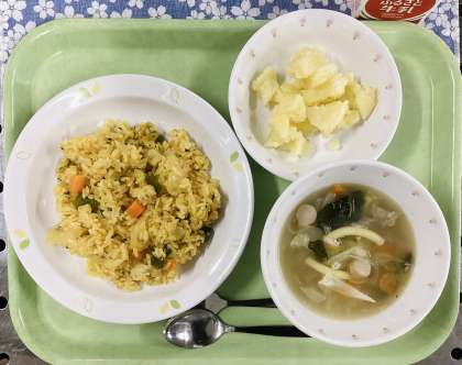 今日は、カレーピラフ、じゃがいものバター焼き、マカロニスープ、牛乳です。