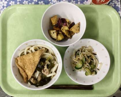 今日は、冷やしきつねうどん、もやしの塩こんぶ和え、大学いも、牛乳です。