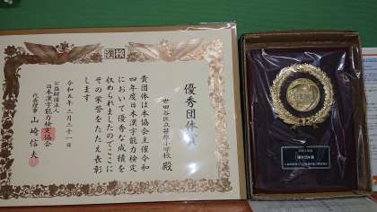 そして、その成績が笹原小学校は、日本全国の小学校の30位以内に入っているということで「優秀団体賞」という賞をもらい、賞状と盾が届きました。