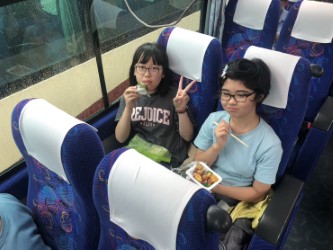 雨が降ったりやんだりの状態なので昼食はバスの中でとることになりました。