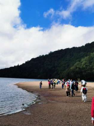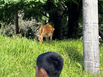 学年集合写真を撮影するために湯の湖へ向かう途中に鹿と出会いました。