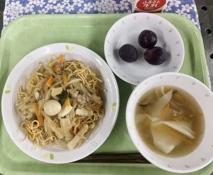 今日は、あんかけ焼きそば、ワンタンスープ、巨峰、牛乳です。