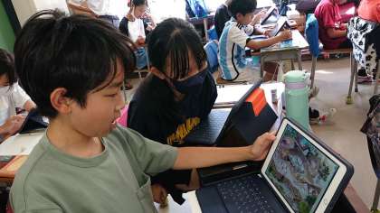 学習用タブレット端末に先生から送られた資料に気付いたことを子どもたちは記入しました。