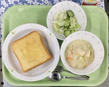 今日は、メープルトースト、サーモンシチュー、グリーンサラダ、牛乳です。