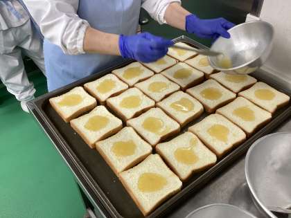 右の写真は、メープルシロップとバターを混ぜ合わせたものをパンに塗っている時の様子です。