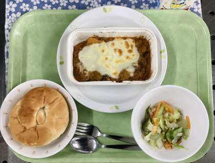今日は、パインパン、ムサカ、フレンチサラダ、牛乳です。