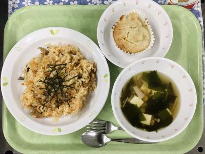 今日は、キンパ風ごはん、わかめとコーンのスープ、りんごケーキ、牛乳です。