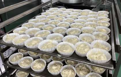 右の写真は、りんごケーキの生地をカップに入れ終えたところの写真です。