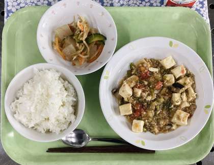 今日は、ごはん、西湖豆腐(シーホードウフ)、こんにゃくサラダ、牛乳です。