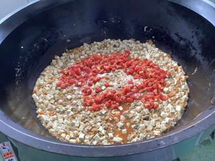 右の写真のように、角切りにしたトマトを入れています。トマトの酸味と、にんにくなどの香味野菜の香りが豆腐にからんで、さっぱりした味に仕上がりました。