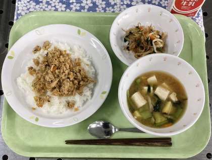 今日は、おからツナ丼、野菜のおかかかけ、さつま汁、牛乳です。