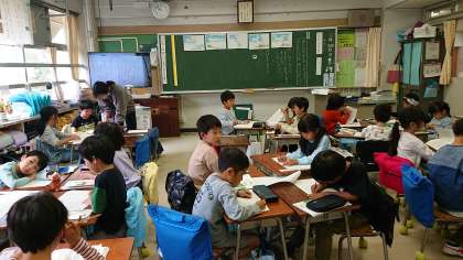 1年2組は、2校時に国語「くじらぐも」の学習に取り組みました。