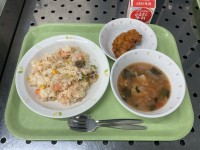 今日は、チーズパン、タンドリーチキン、ビーンズサラダ、ベーコンと野菜のスープ、牛乳です。