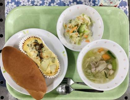 今日は、黒砂糖パン、ほうれん草のキッシュ、アップルドレッシングサラダ、ABCスープ、牛乳です。