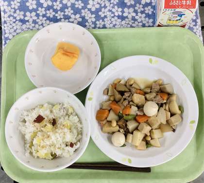今日は、さつまいもごはん、鶏肉と里芋のうま煮、柿(梨から変更になりました)、牛乳です。