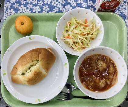 今日は、ガーリックフランス、じゃがいものハニーサラダ、魔女の宅急便の肉団子スープ、みかん、牛乳です。