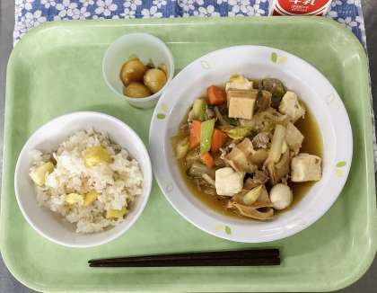 今日は、栗ごはん、すき焼き煮、お月見みたらしだんご、牛乳です。