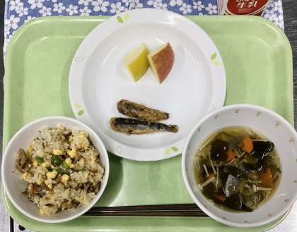 今日は、豚肉とごぼうのごはん、こいわしのガーリック揚げ、すまし汁、りんご食べ比べ(黄:シナノゴールド、赤:ふじ)、牛乳です。