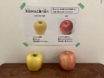 今日は、りんごの食べ比べをしました。八百屋さんからおすすめのりんごを2種類届けてもらいました。黄色がシナノゴールド、赤色がふじです。