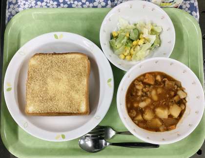 今日は、セサミハニートースト、イタリアンドレッシングサラダ、ポークビーンズ、牛乳です。