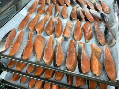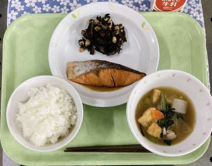 今日の給食では、ねこが捕まえに行った大きな魚をイメージして、お魚屋さんから立派な「鮭」を届けてもらいました。その鮭を、今日は照り焼きにしています。