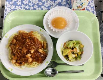 今日は、シーフードトマトスパゲティー、さつまいものサラダ、おかしなお菓子な目玉焼き、牛乳です。