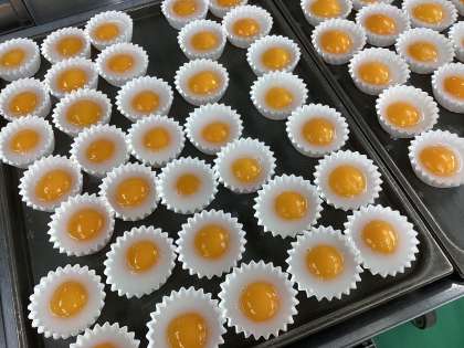おかしなお菓子な目玉焼きは、半分に切ってある黄桃をカップに入れ、周りに乳酸菌飲料で作ったゼリーを流し込んで、まるで目玉焼きのように見せています。