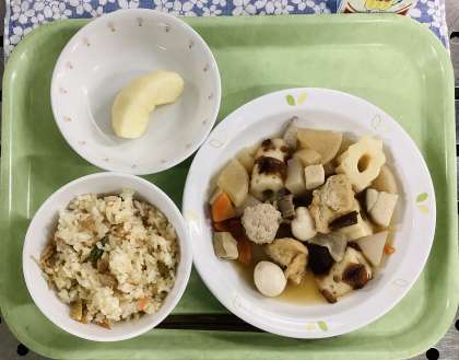 今日は、子ぎつねごはん、九太のおでん風煮しめ、りんご、牛乳です。